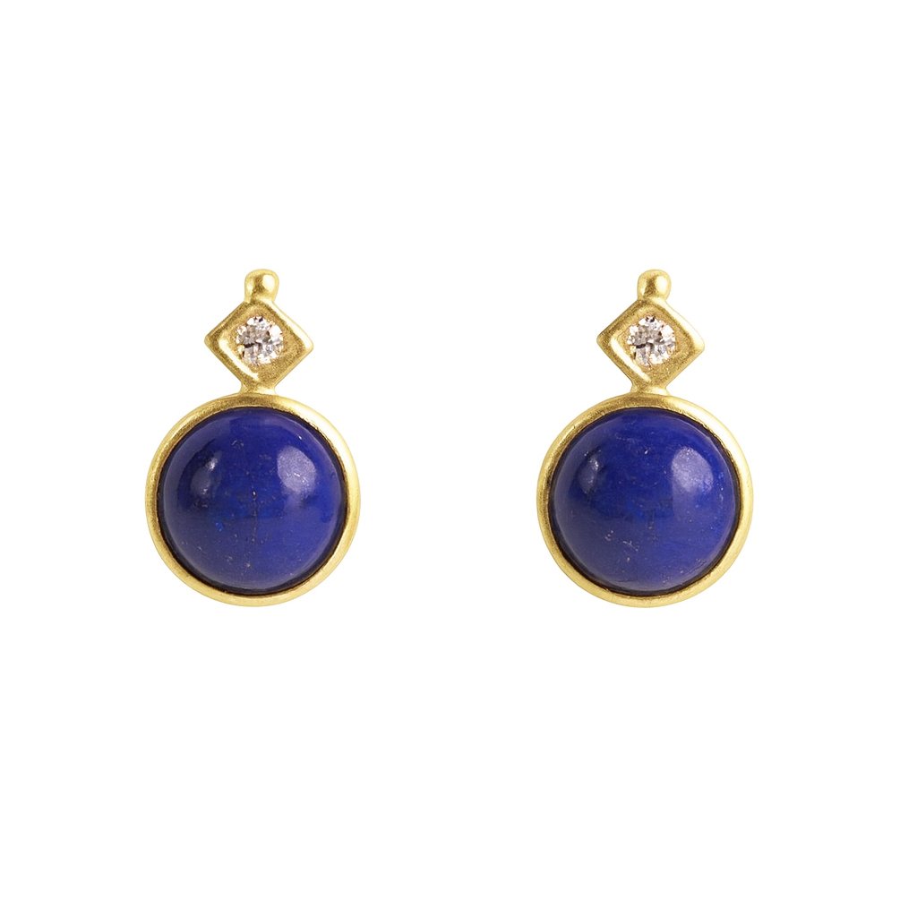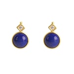 These stud earrings feature natural lapis cabochons framed in a clean, circular silhouette, accented with a subtle hint of diamond. The result is a pair that brings structure and elegance to the ear — bold in color, yet quietly sophisticated.