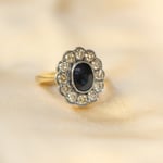 A timeless heirloom, this ring features a deep midnight-blue sapphire embraced by scalloped antique gold lace and crowned with a delicate halo. Champagne diamonds glow softly, weaving a story of enduring love and quiet elegance—equally perfect as a daily treasure or a bold statement piece.