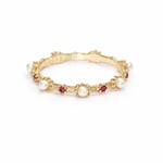 A soft brushed finish gold band set with natural rubies and luminous pearls, linked by delicate, hand-finished details.