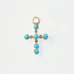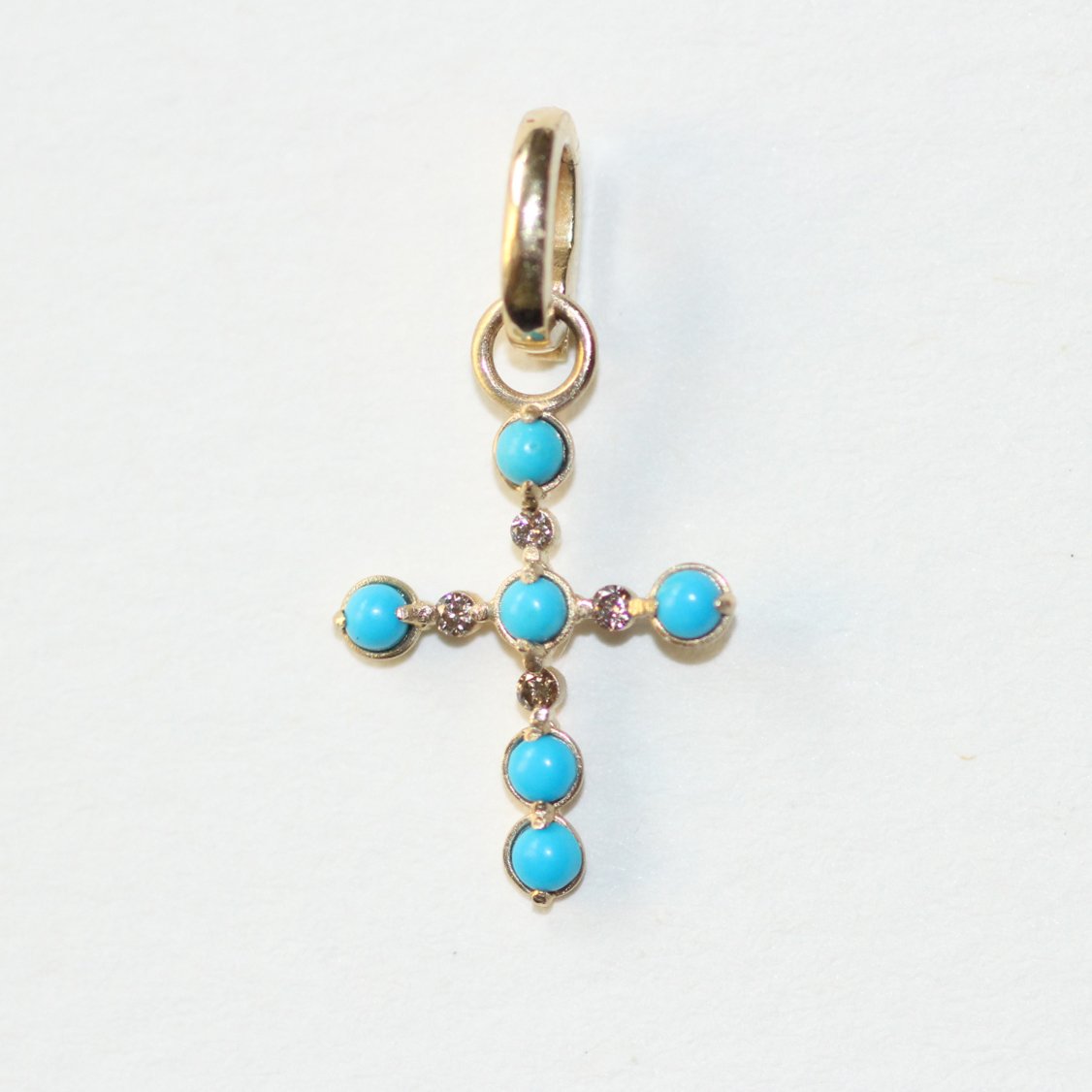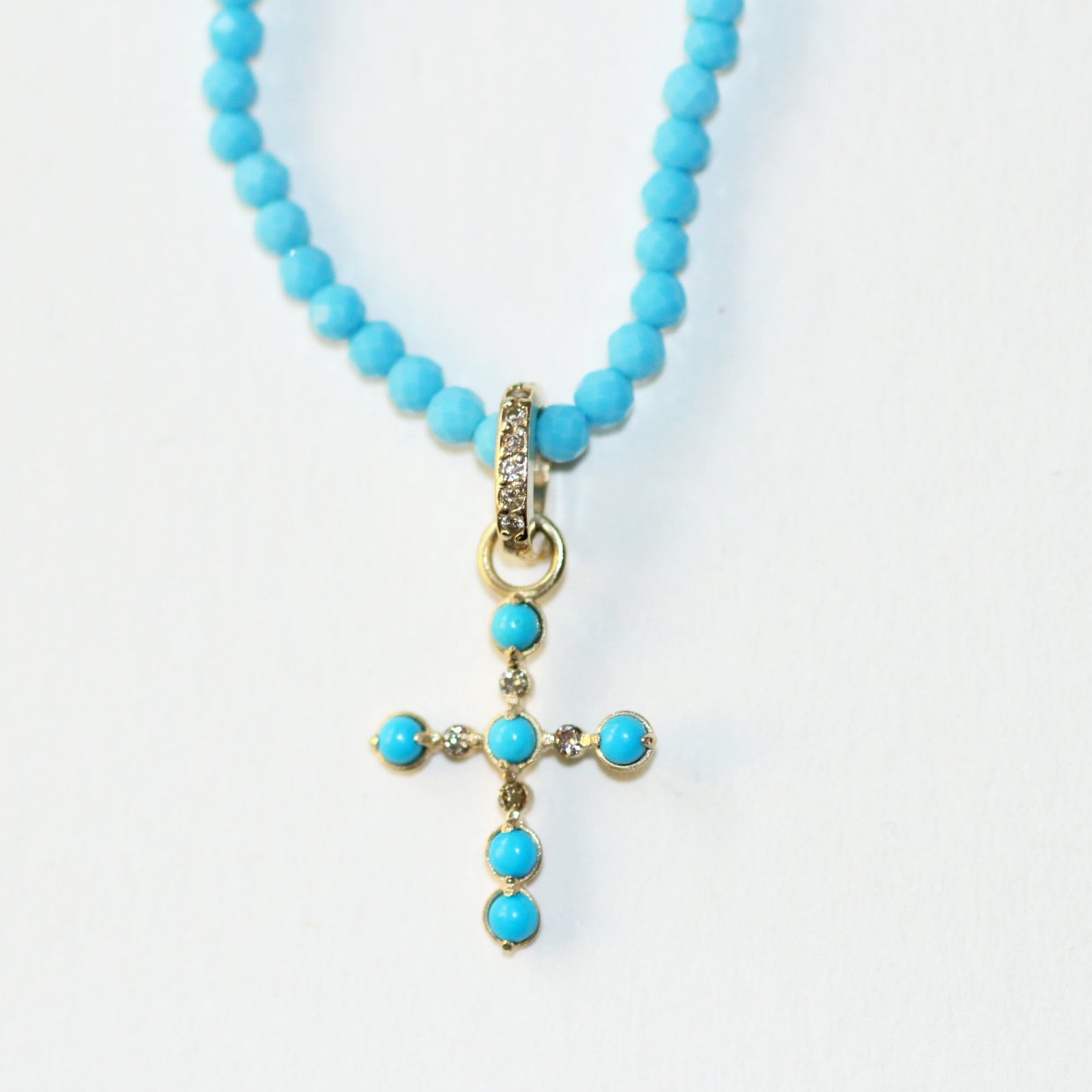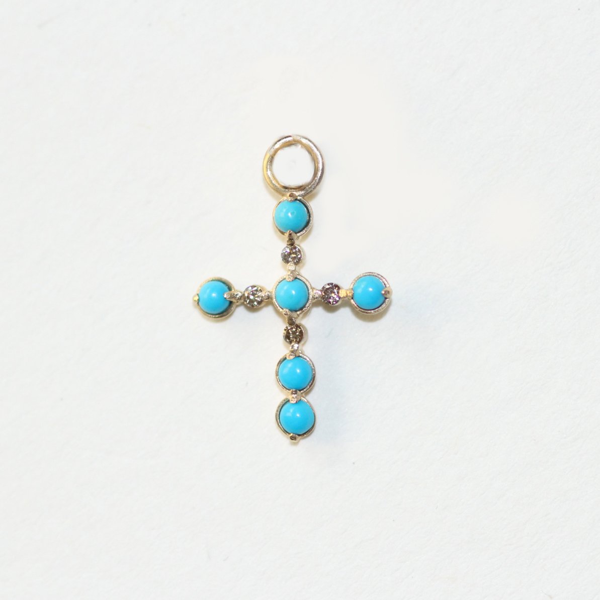Dainty and romantic, the Ella Cross adds a versatile charm to your collection. Pair it with our pendant clip to wear on a chain or beaded necklace, or let it dangle gracefully from our pearl huggie hoops for an elegant earring look. Tiny turquoise and champagne diamonds come together in the most delicate harmony—an effortlessly refined, timeless piece.