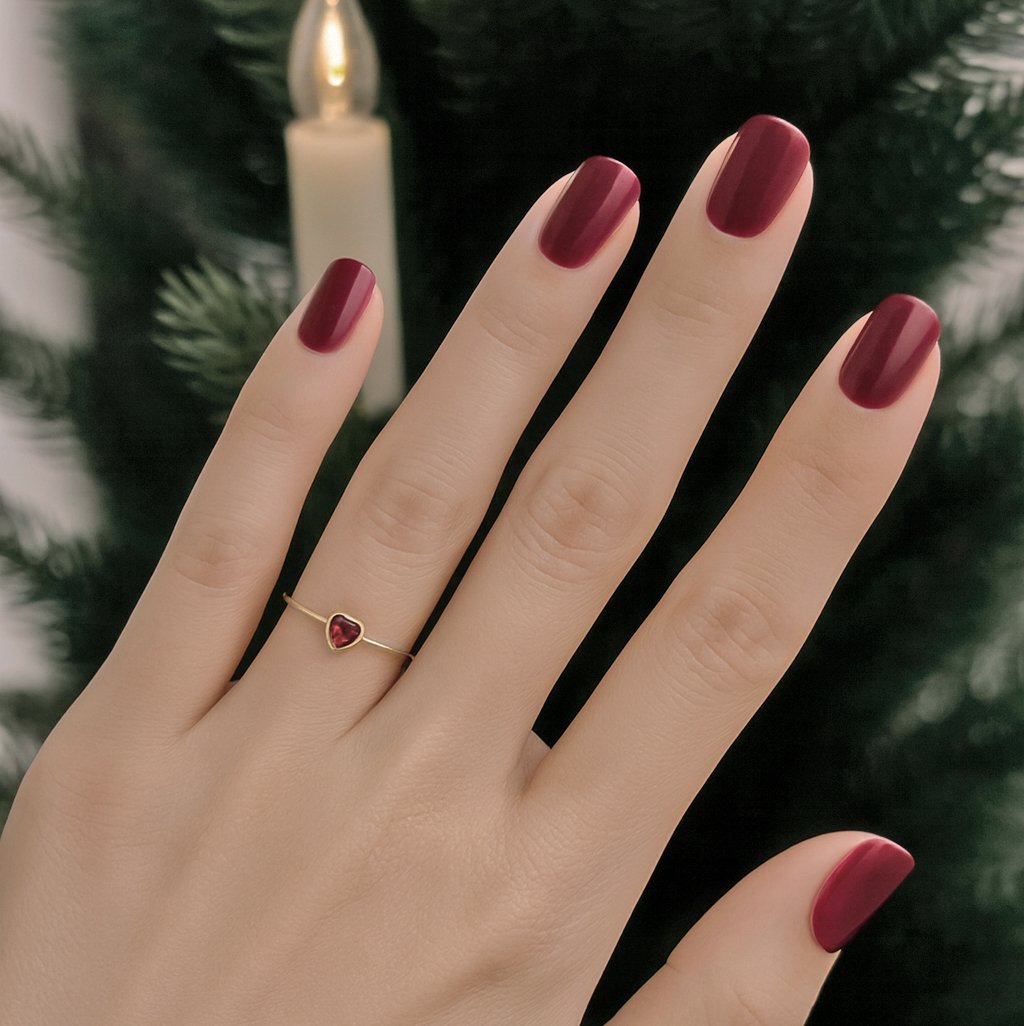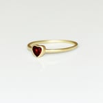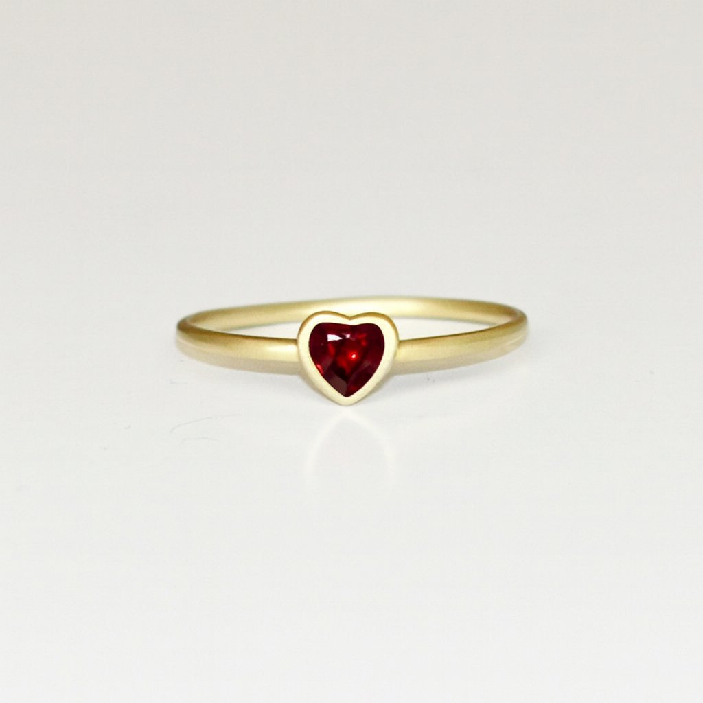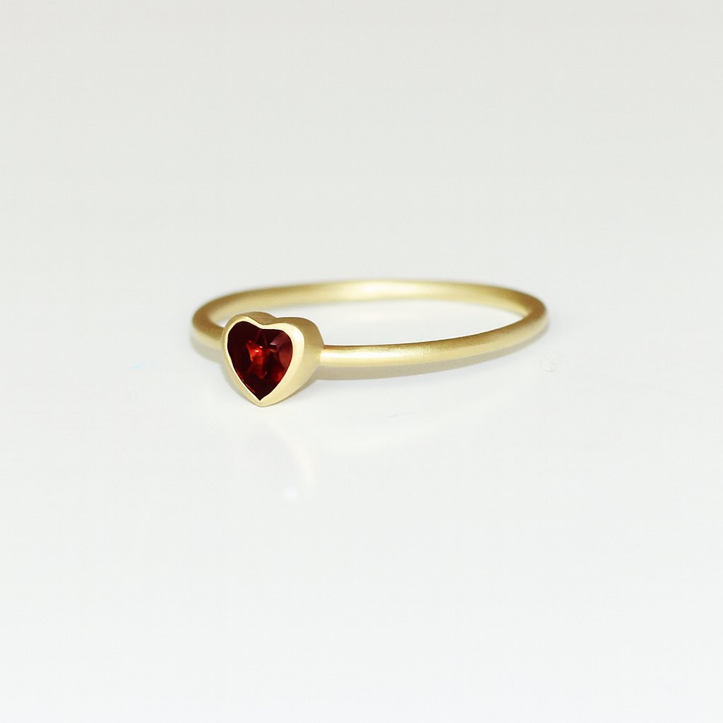 A delicate thread of metal forms this ring, centered by a deep red, heart-cut garnet. The soft satin finish contrasts beautifully with the vivid garnet, creating a subtle yet meaningful accent for everyday wear. Perfect on its own or stacked with your favorite rings.