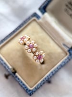 Each bloom harmoniously blends a vibrant pink sapphire center with the timeless elegance of classic pearls.