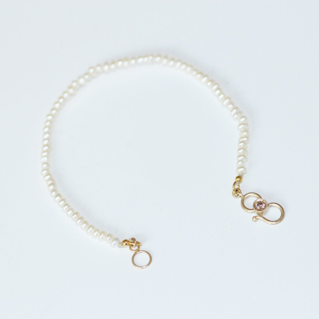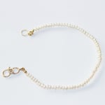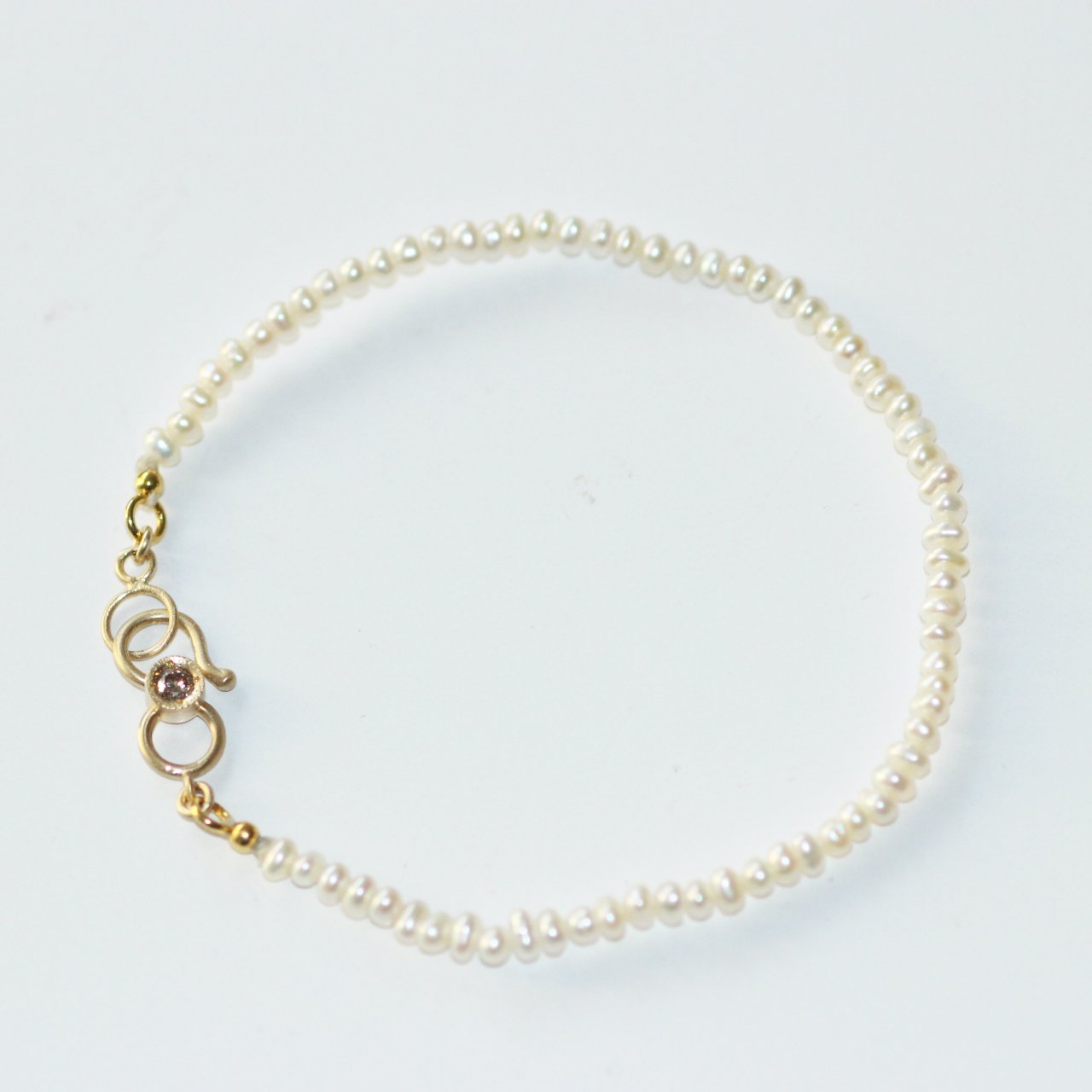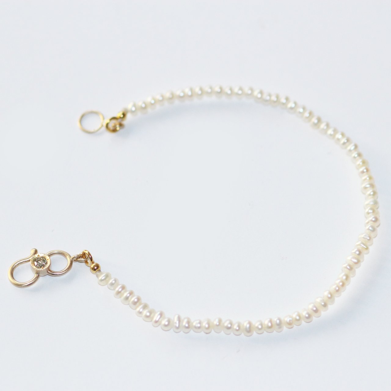 A strand of baby pearls, each one soft and luminous like a secret kept by the sea. At its heart, a handcrafted hook set with a champagne diamond—delicate yet quietly radiant.