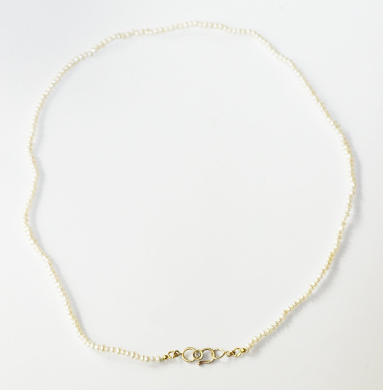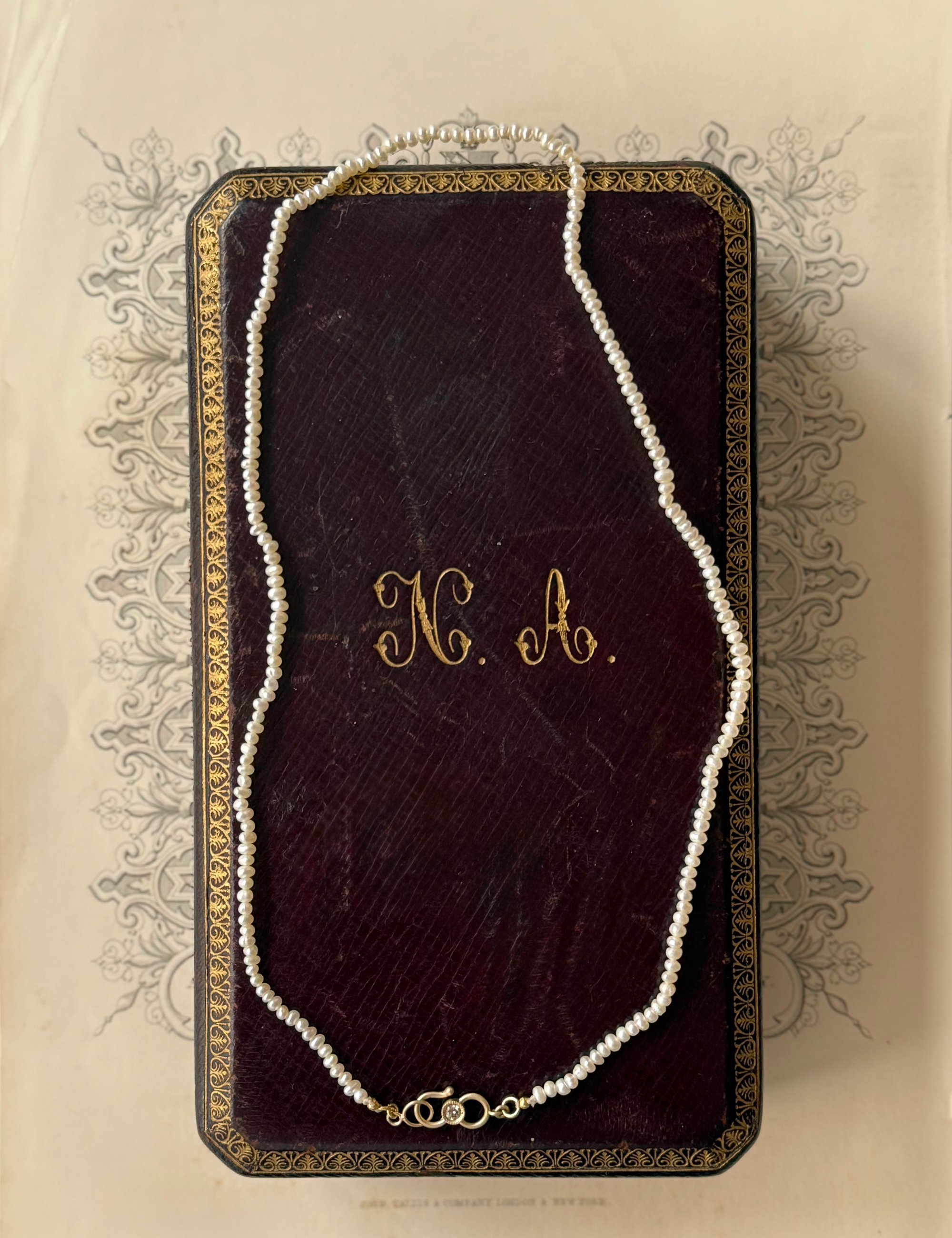 Like a string of moonlight gathered from the sea, this choker is woven of the tiniest 2.5mm freshwater baby pearls—soft, luminous, and endlessly tender. At its heart, a delicate hook glimmers with champagne diamond, a quiet spark that feels like a secret kept close.