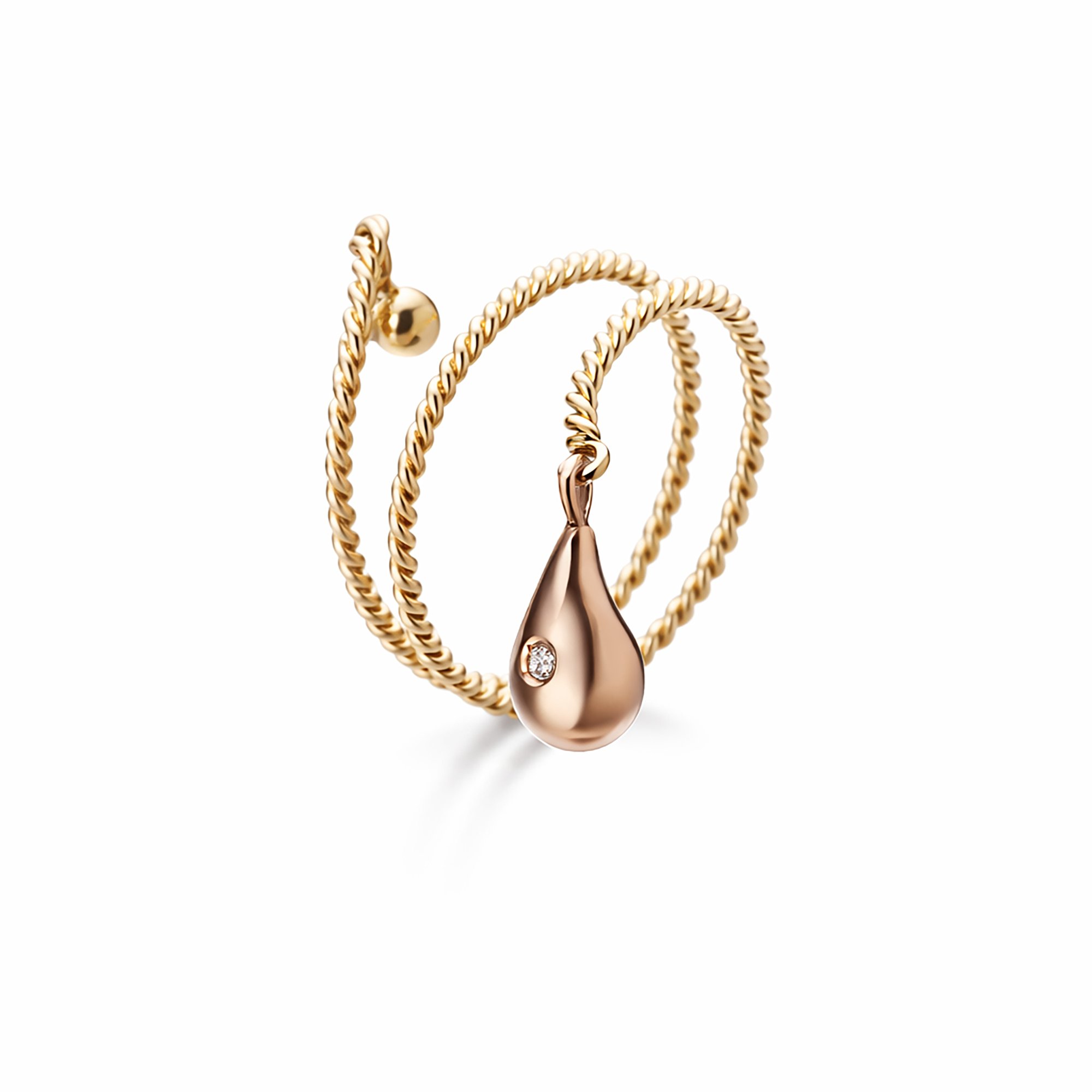 suspended from a spiral gold band that gently wraps the finger.