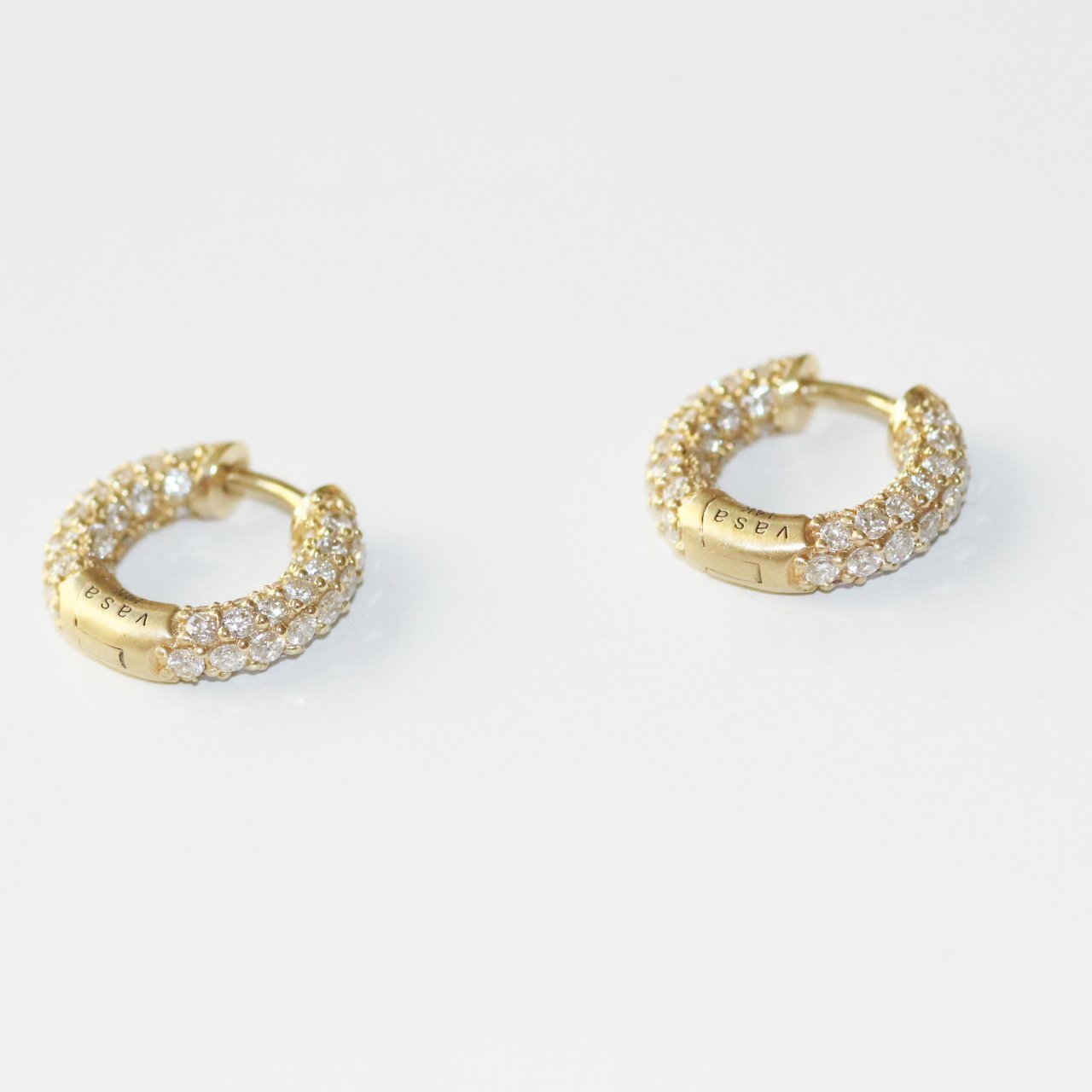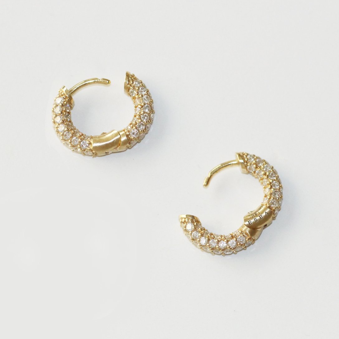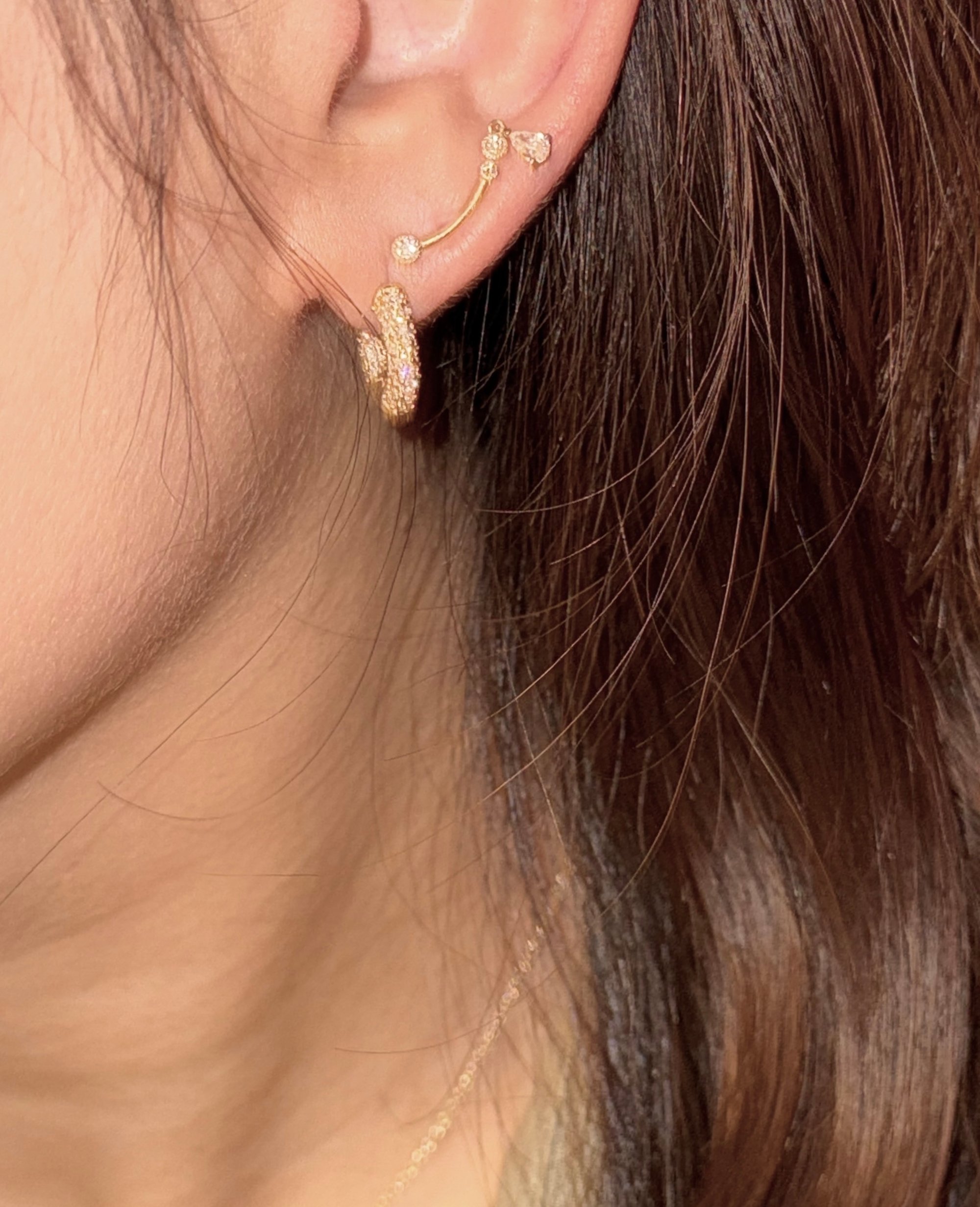 Daily essential. Our most glamorous yet versatile stardust huggie, now in a smaller silhouette. Lab-grown white diamonds shimmer across satin-finished gold, secured with a simple click. Effortlessly elegant — the huggie hoop you’ll never want to take off.